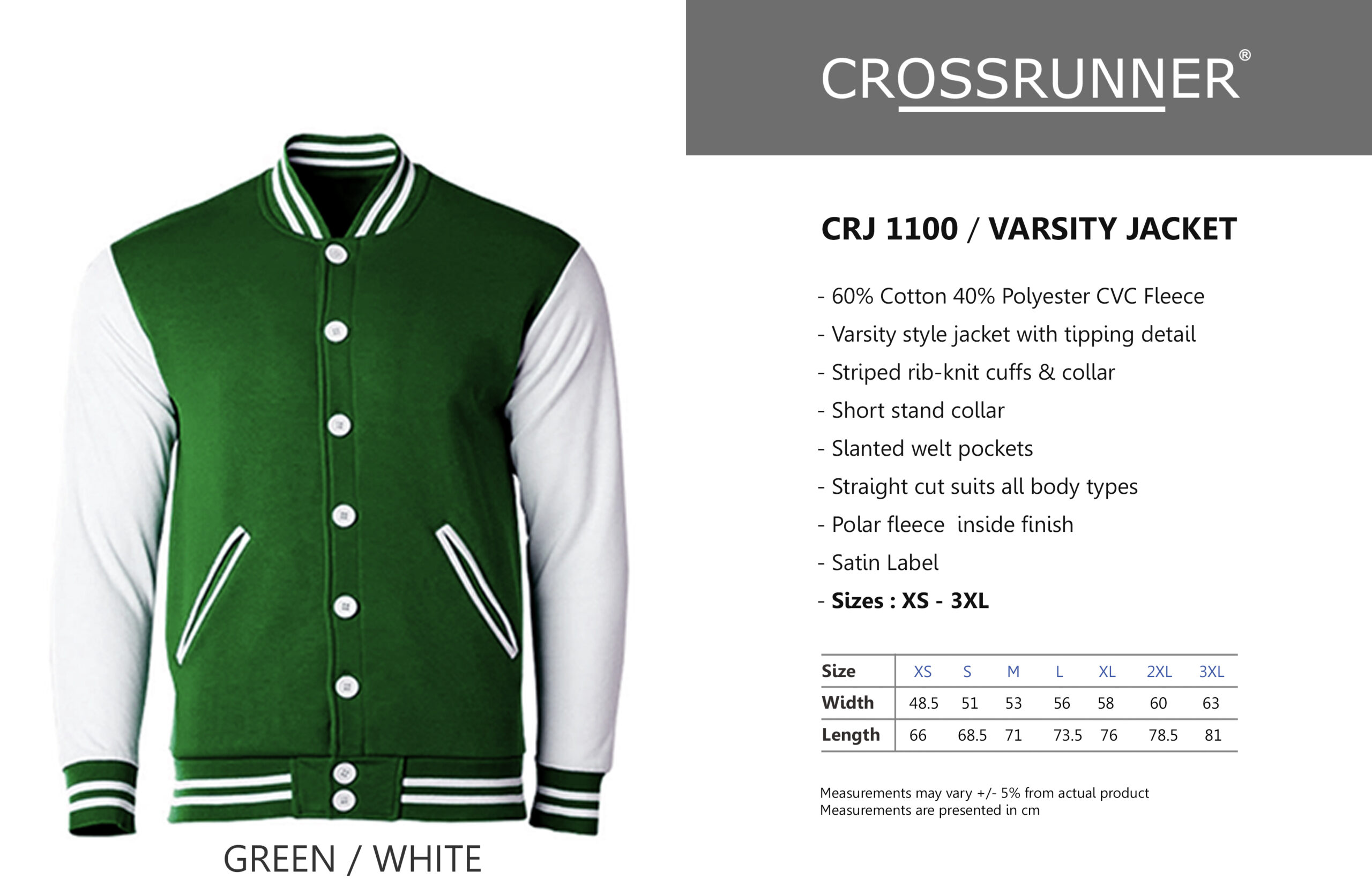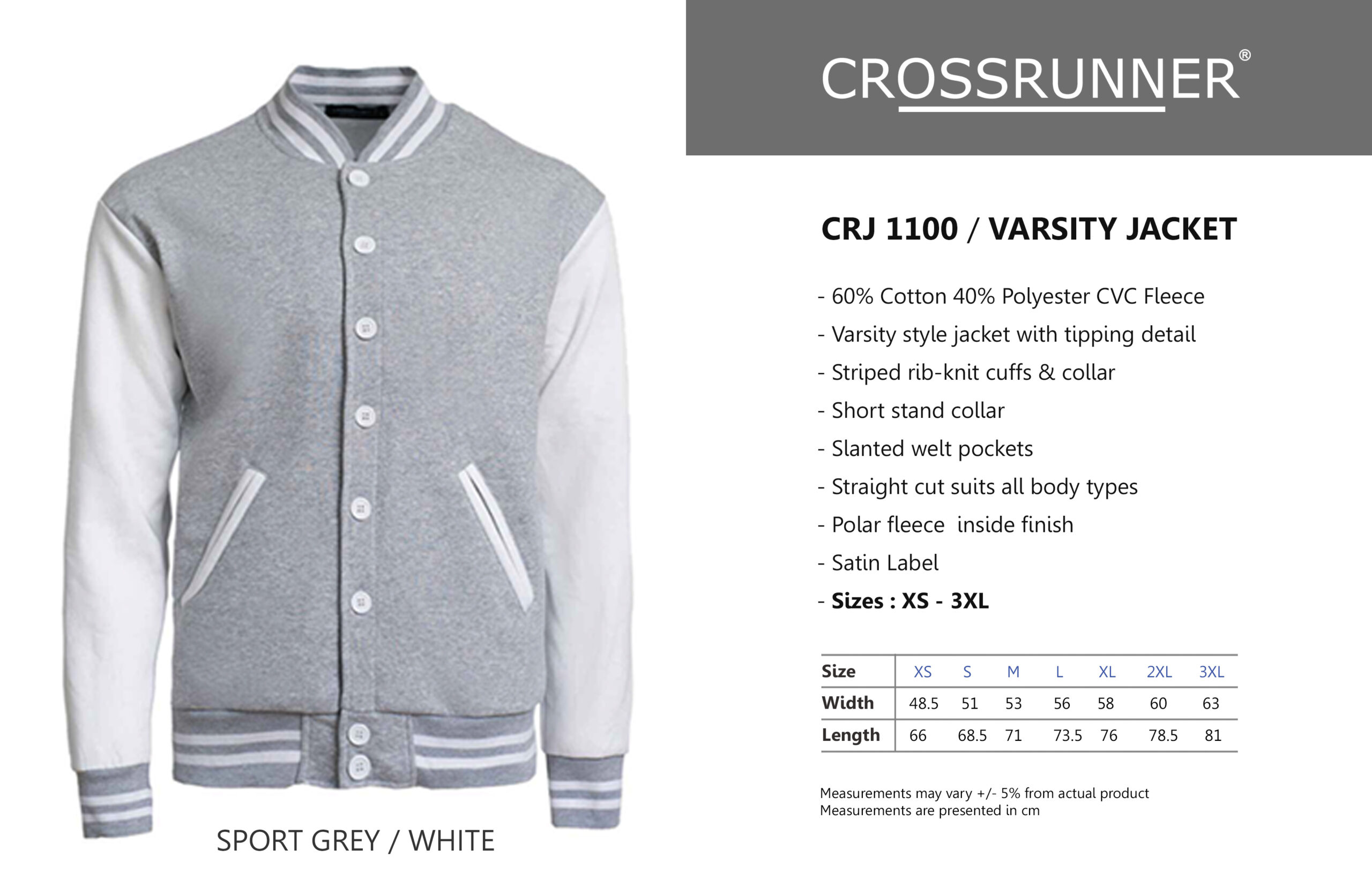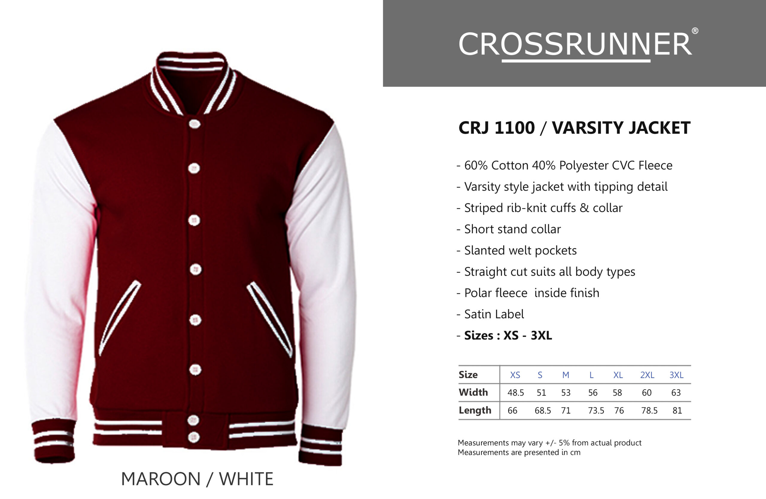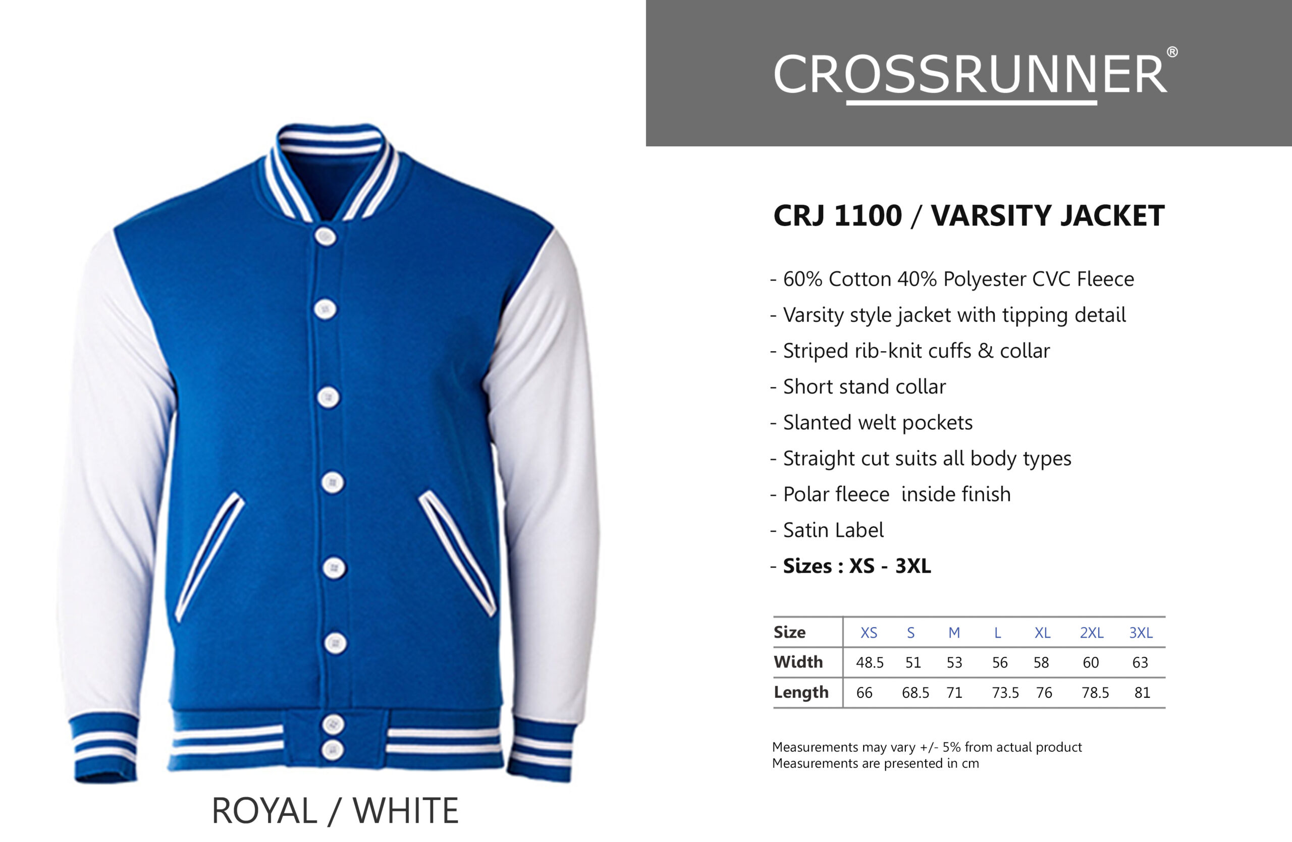 • 60% Cotton 40% Polyester CVC Fleece – Varsity style jacket with tipping detail